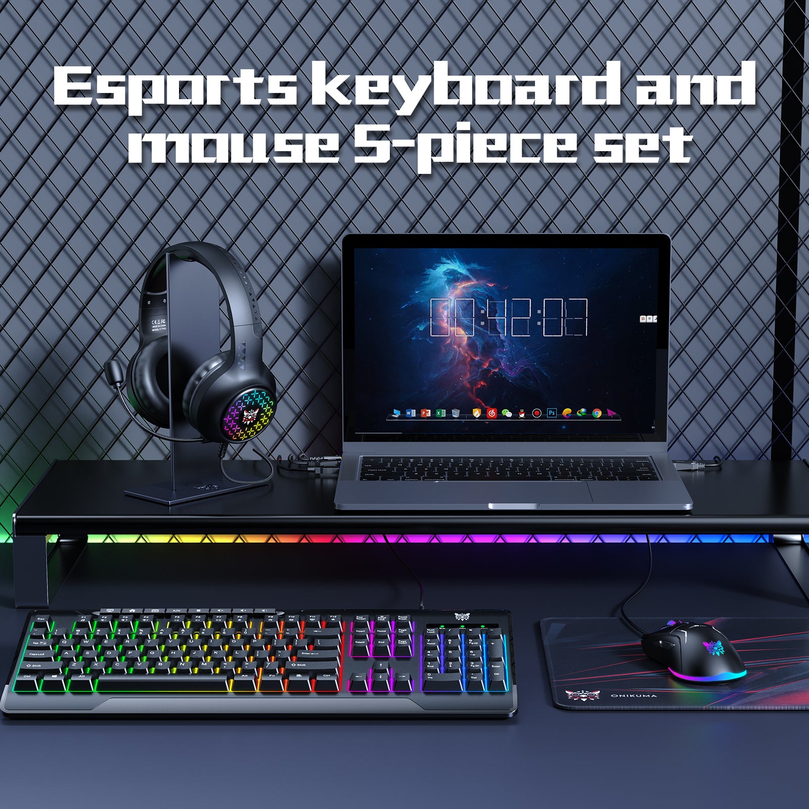 - Complete 5-in-1 Gaming Combo: This set includes a gaming keyboard, wired headset, precision mouse, durable mouse pad, and a headphone stand.