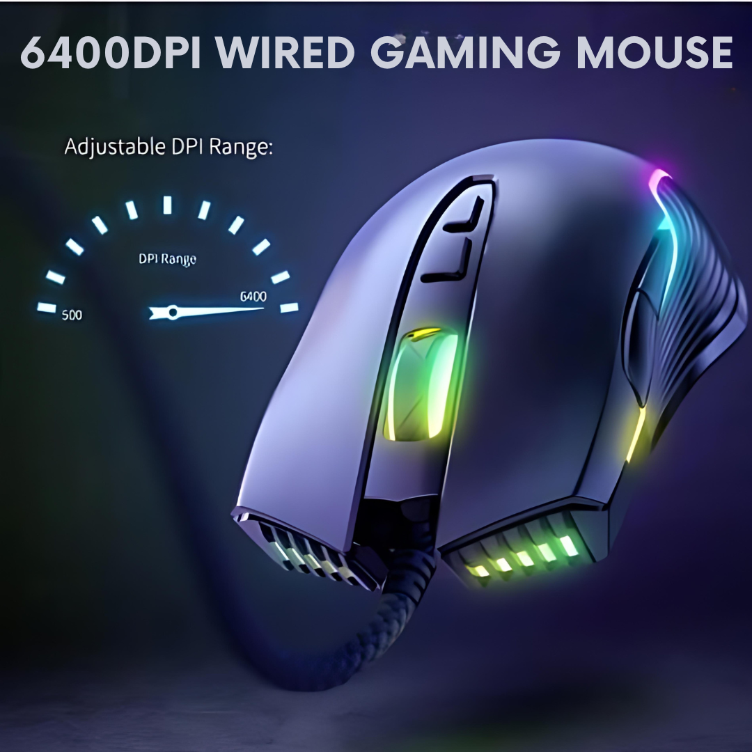 Adjustable 6400 DPI Wired LED Gaming Mouse with Breathing LED Colors Black