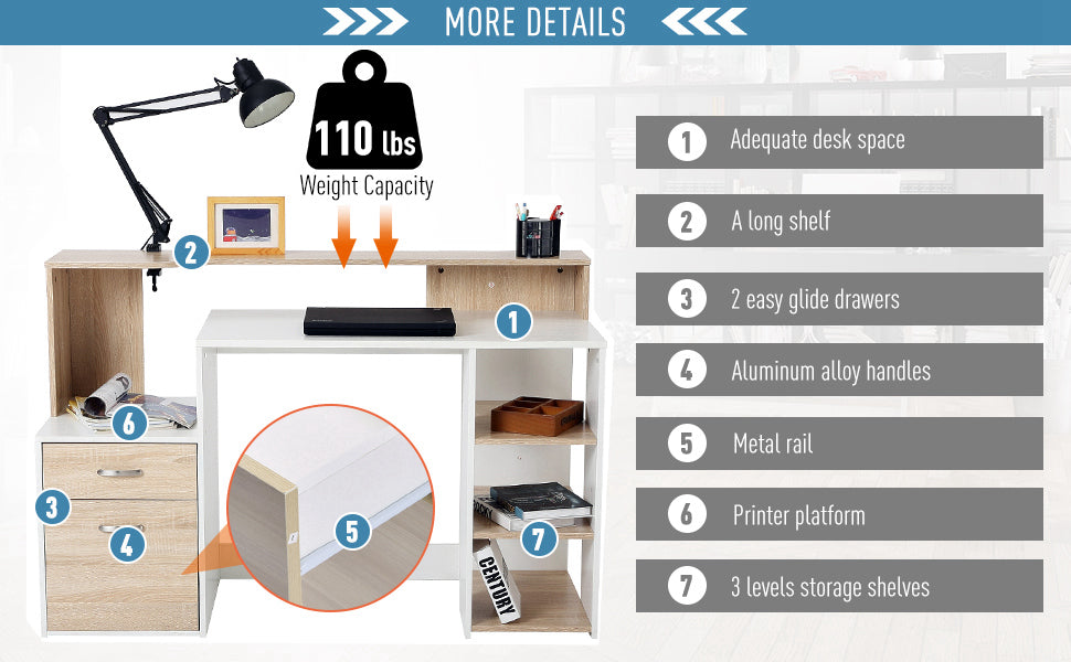 Modern Computer Desk with Drawers and Storage Shelves, Study Workstation, Writing Desk with Printer Stand for Home Office, Oak and White
