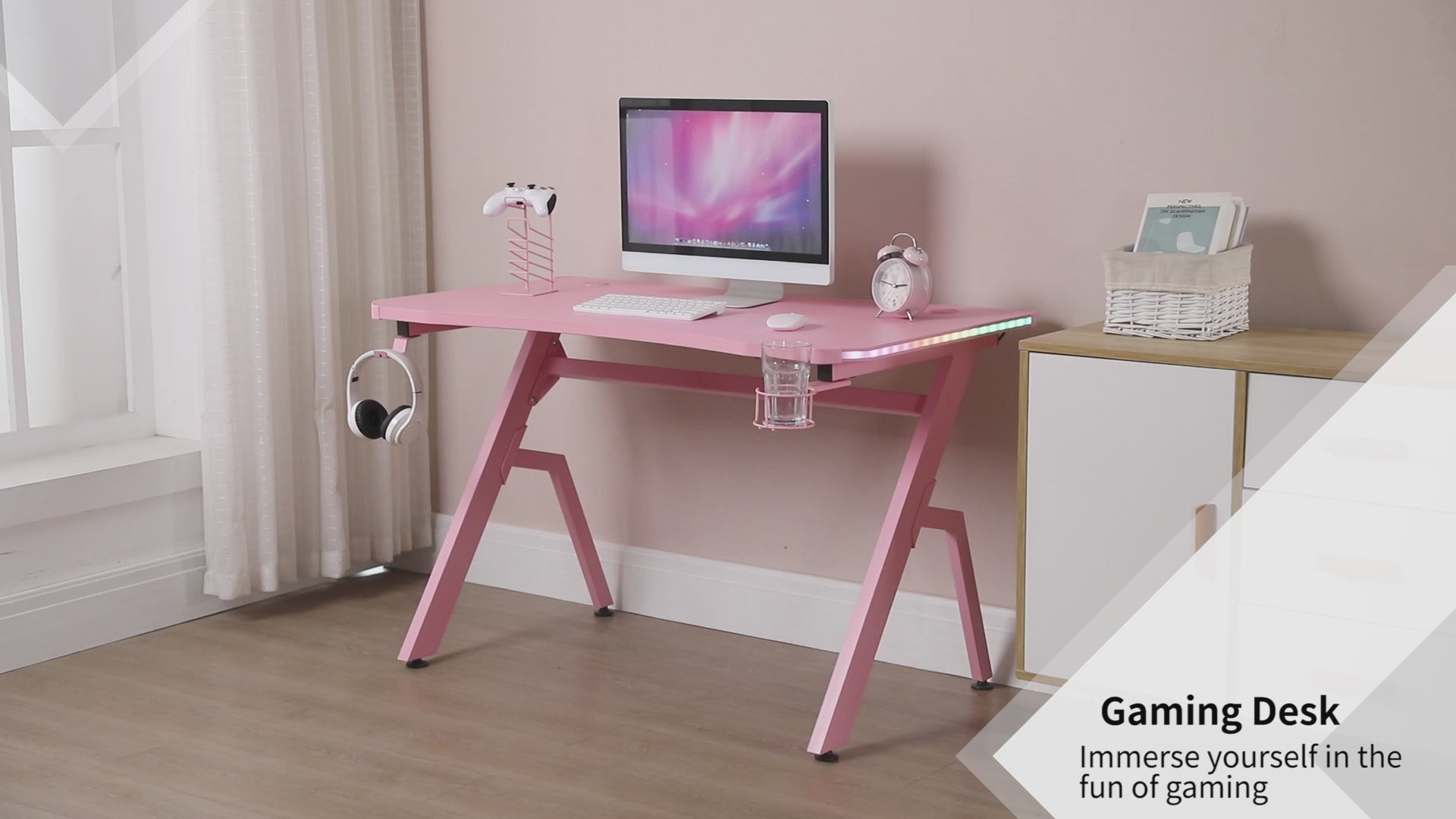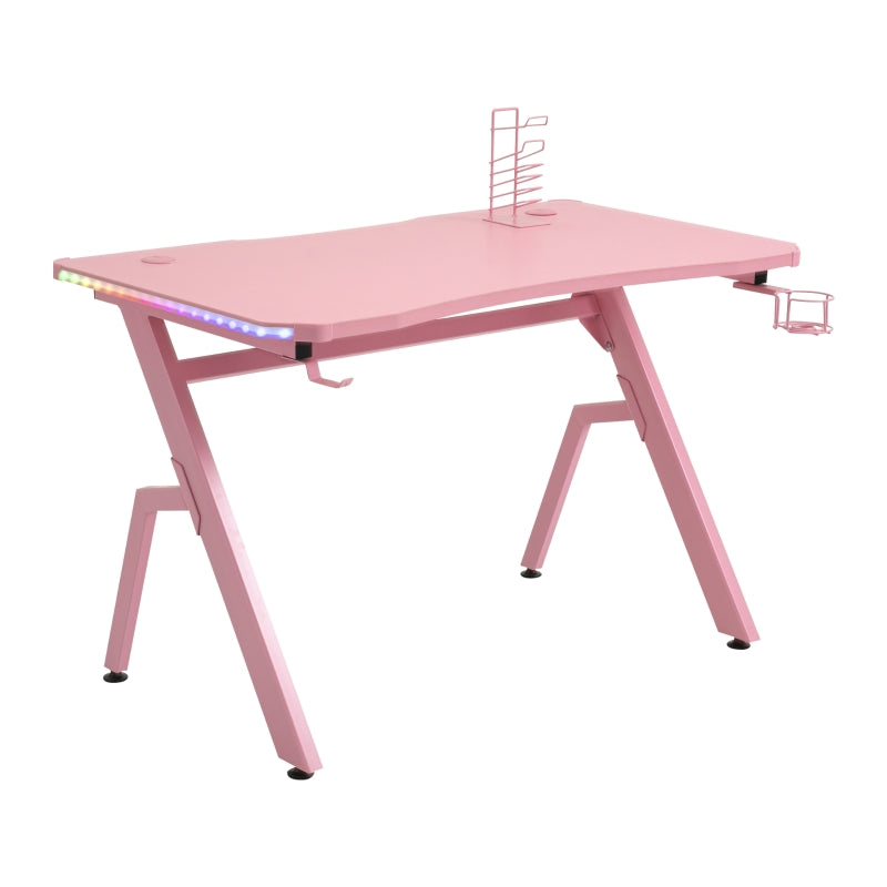 LED Pink Gaming Desk Office Desk Computer Table RGB Carbon Fibre Surface Headphone Hook Cup Holder Controller Rack Pink
